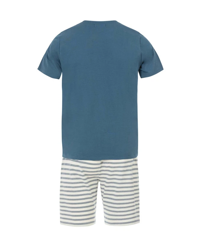 - Haut : T-shirt manches courtes, couleur unie bleue, col rond contrasté.