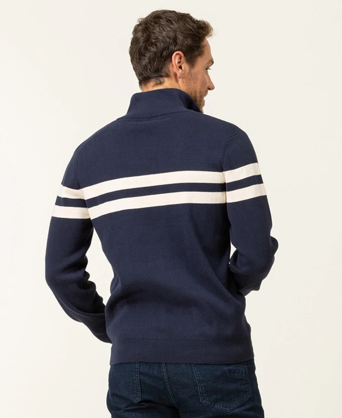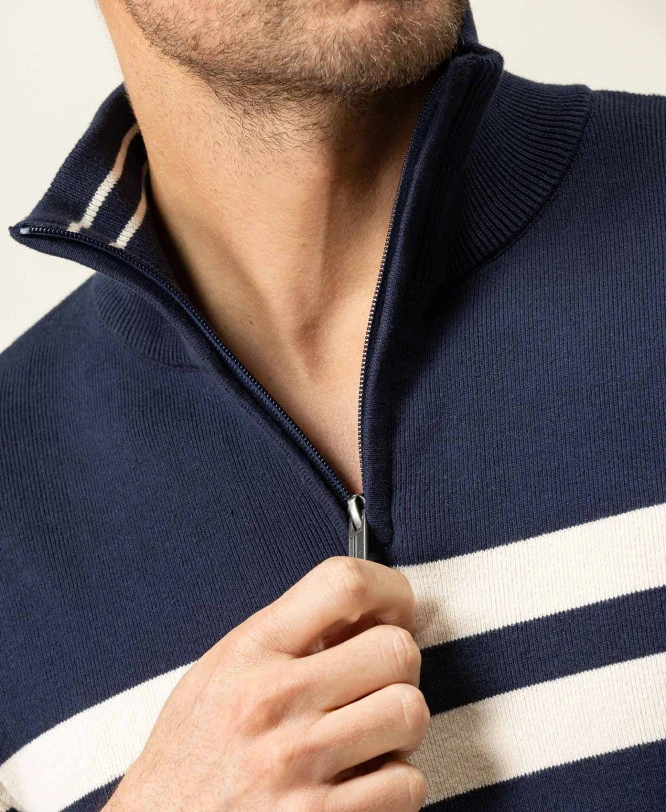 - Col Camionneur Versatile : Ouverture zippée pratique avec un curseur gravé élégant et un intérieur de col rayé pour une touche de détail raffinée.