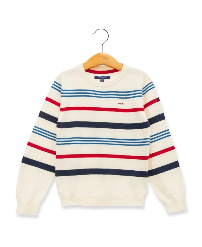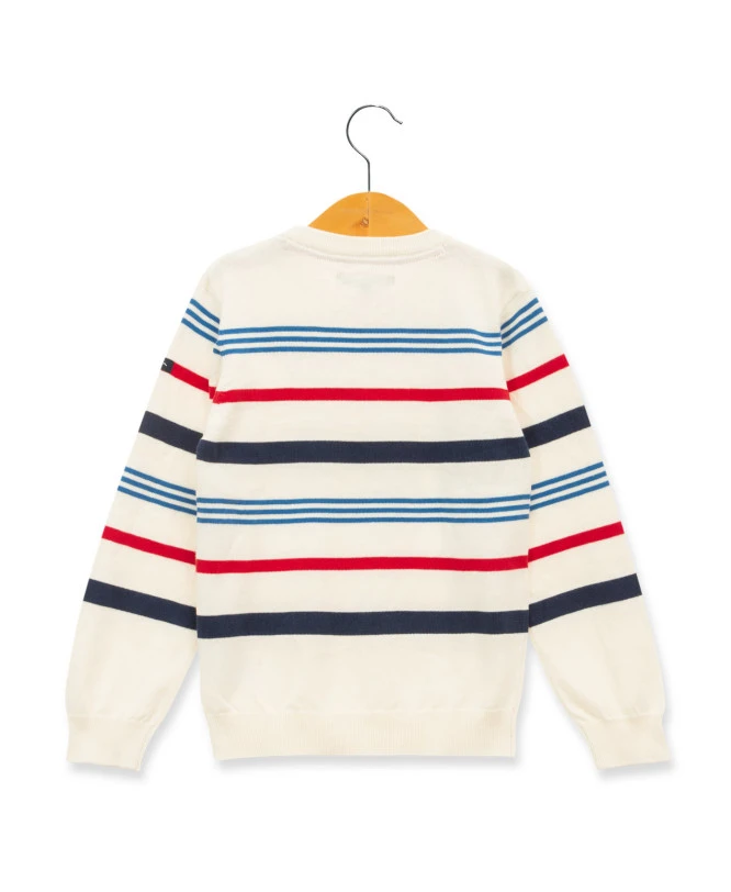 - Style Dynamique et Coloré : Ce pull arbore des rayures rouges et bleues vibrantes sur un fond blanc éclatant, idéal pour apporter une touche de peps à la garde-robe de votre petit explorateur.