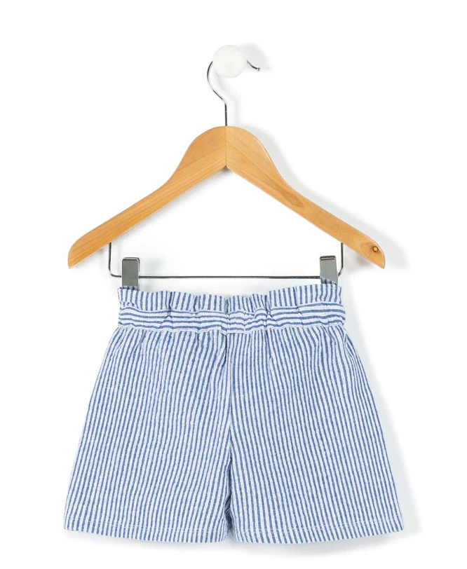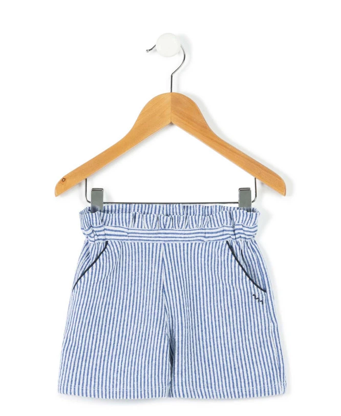 Offrez à votre enfant un look estival rafraîchissant avec le short Quessie. Ce modèle aux rayures classiques bleu et blanc se distingue par sa texture travaillée et son allure marine chic, idéale pour toutes les aventures estivales, des sorties à la mer aux après-midis au parc.