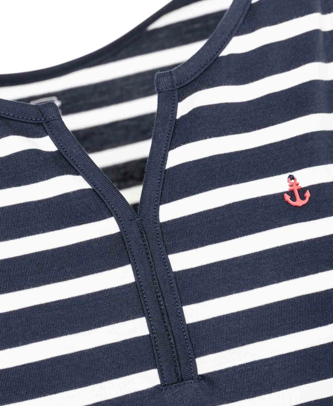 - Design : Finition col et emmanchures contrastées, détail ancre poitrine