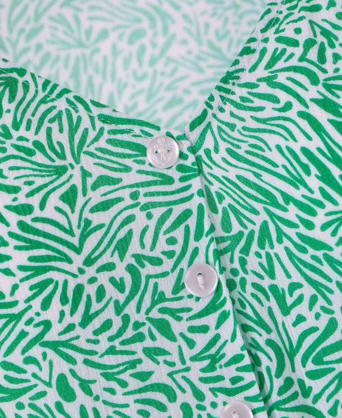 - Détails Raffinés : Une fausse ouverture boutonnée avec des boutons fantaisies apporte une touche de sophistication unique à l’imprimé exclusif.