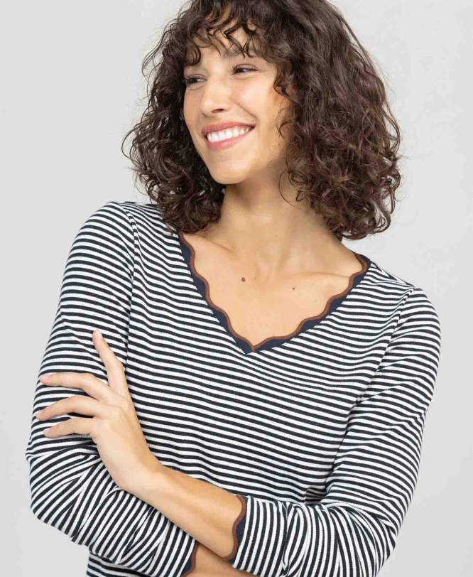- Style Marin Authentique : Un motif rayé blanc et indigo indémodable qui se marie facilement avec un jean ou un pantalon de travail.